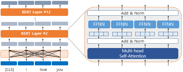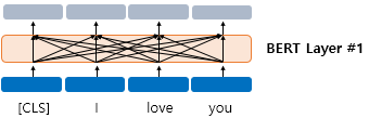 BERT의 첫번째 층에 입력된 각 단어가 모든 단어를 참고한 후에 출력되는 과정 (문맥파악)