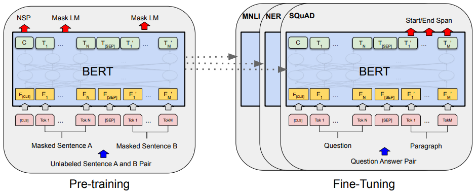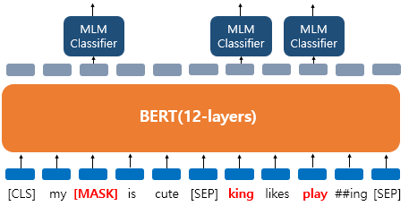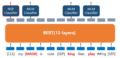 위의 그림에서 나타난 것과 같이 MLM(Masked Language Model)과 NSP(Next Sentence Prediction)은 따로 학습하는 것이 아닌 loss를 합하여 학습이 동시에 이루어짐.