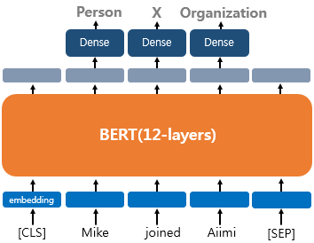 개체명인식은 각 토큰마다 벡터가 나오기 때문에 각 토큰마다 tagging 을 하도록 Layer를 추가
