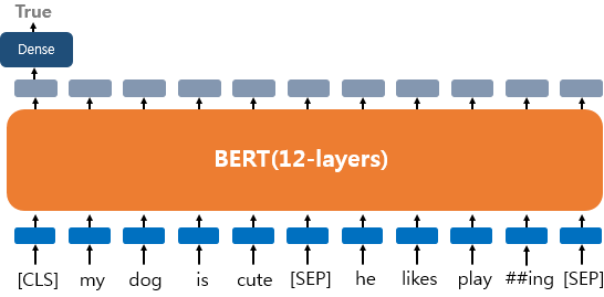 그리고 이 두 문장이 실제 이어지는 문장인지 아닌지는 [CLS] 토큰의 위치의 출력층에서 이진 분류 문제를 풂.