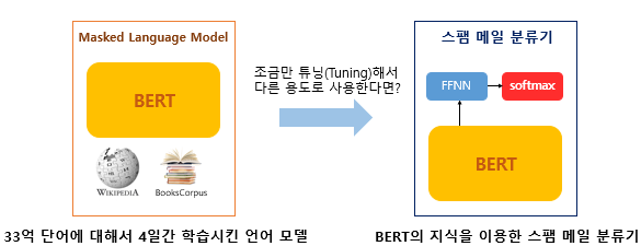 이 경우 BERT가 Language Model Pre-train 과정에서 얻은 지식을 활용하여 » 스팸메일분류에서 보다 좋은 성능을 낼 수 있음.