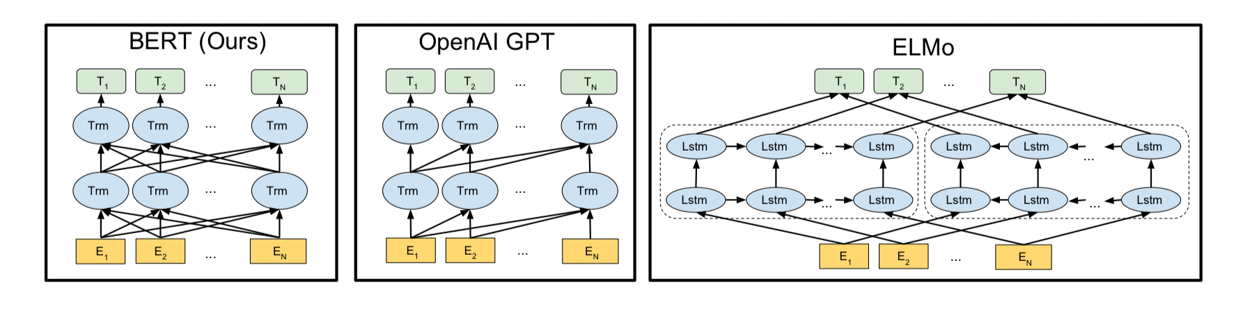 - 가장 좌측 BERT는 화살표가 양방향으로 뻗어나가는 모습을 보임! 이는 MLM(Masked Language Model)을 통해 양방향성을 얻었기 때문