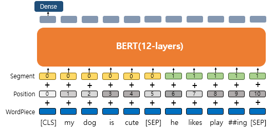 첫번째문장에는 sentence -, 두번째문장에는 sentence 1 임베딩을 더해주는 방식이며 임베딩 벡터는 이렇게 두개만 사용됨.